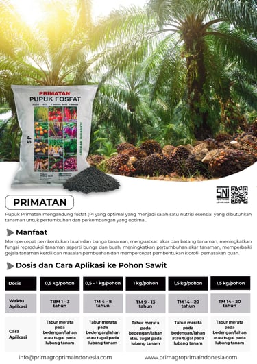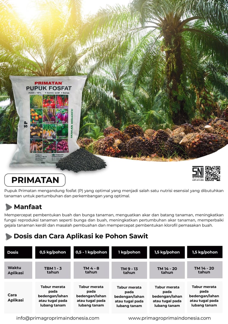 Pupuk Primatan mengandung fosfat (P) yang optimal yang menjadi salah satu nutrisi esensial yang dibutuhkan tanaman untuk pertumbuhan dan perkembangan yang optimal. Fosfat berperan penting dalam berbagai proses metabolisme tanaman, seperti transfer energi, pembentukan membran sel, pembelahan sel, dan pengangkutan nutrisi. Kekurangan fosfat dapat menyebabkan pertumbuhan tanaman yang terhambat dan hasil panen yang rendah.